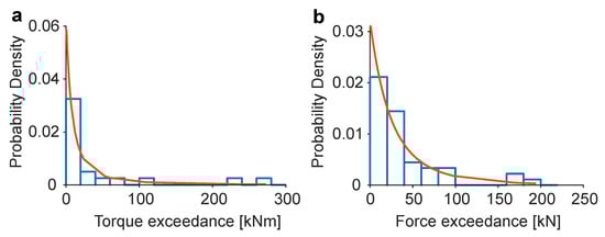 According to the mean excess plot, the threshold should be selected at the inflection point where there is a sharp decrease. However, choosing the threshold at this point may result in a very small number of extreme values, making it difficult to support the fitting of the GPD. Therefore, by considering the relationship between shape and scale parameters and the threshold, as well as the current goodness of fit (p-value), it is possible to select a reasonable threshold. The final threshold for torque was chosen as 79.445 kNm, and for force, it was 160.202 kN. The parameter selection for the GPD is shown in Table 1. The final fitting results are depicted in Figure 9, illustrating the goodness of fit achieved.