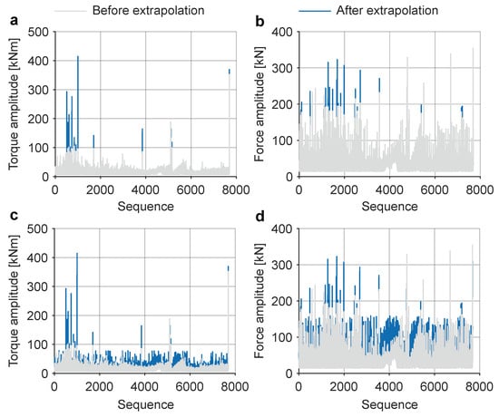 Load extrapolation for amplitude sequence. (a) Extreme extrapolation of torque amplitude, (b) extreme extrapolation of force amplitude, (c) load extrapolation of torque amplitude, and (d) load extrapolation of force amplitude.