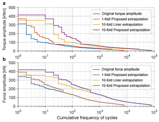 Cumulative frequency of cycles for load extrapolation. (a) Torque amplitude extrapolation, (b) force amplitude extrapolation.
