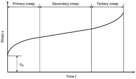 A creep curve obtained from experimental tests typically assumes three phases, named primary or transient creep, secondary or steady-state creep, and tertiary or unstable creep. These three phases appear due to the balance between strain hardening and strain softening phenomena in the material: initially the strain rate decreases due to hardening phenomena until an equilibrium between softening and hardening processes is reached, constituting the secondary creep phase. After continuum deformation in the steady-state regime, due to the accumulated damage and necking (reduction in effective cross section due to elongation for tensile tests), the strain rate increases rapidly since the material is no longer able to withstand the applied load and eventually fails []. Figure 1 represents a typical creep curve where the three phases can be observed.