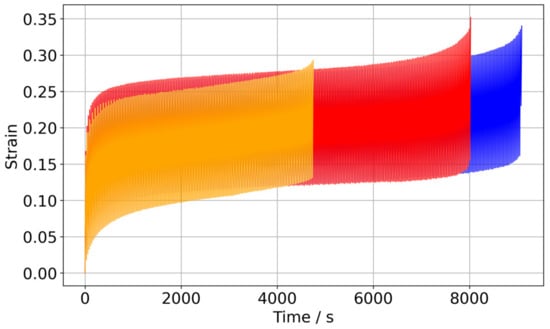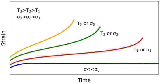 The shape of the curve, and thus the creep behaviour, is heavily dependent on the applied stress and testing temperature. Typically, with increasing stress, the creep time to failure decreases, and the observed strain rate increases. When increasing temperature, the creep time to failure also decreases, and the creep strain rate increases due to the increased freedom for molecular mobility and diffusion processes, depending on the material []. This behaviour is depicted in Figure 2, where the different colours correspond to the creep curves for the different load and temperature conditions.