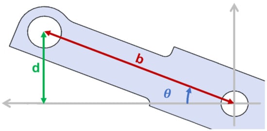 The setup for data collection is composed of an axial potentiometer (Figure 3a) that measures the angle of the lever, which can be translated to the vertical displacement at the joint by Equation (1), where is a coefficient characteristic of the potentiometer. For angles smaller than 13.99° or 0.2441 rad, the small angle approximation induces an error of less than 1%. Considering the dimensions of the lever, this angle results in mm, which is higher than the maximum displacement observed for the adhesives tested of mm. Therefore, the approximation was considered valid for the presented design. Figure 5 depicts the variables used to convert the angle to vertical displacement.