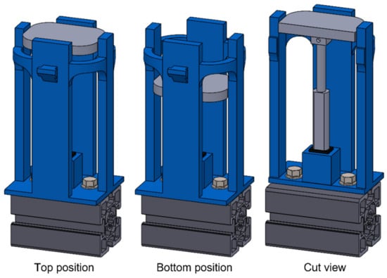 The additional system to support the hanging weight for loading and unloading the joint is composed of an electrical linear actuator, which moves the platform that supports the weight. When this platform is on the top position, the joint is unloaded and the weight is supported, and when it moves down, until the bottom position, it releases the weight and loads the joint. A guidance structure is present for aligning the platform for a vertical movement, as well as to reduce oscillation of the hanging weight when it is no longer supported, something which was observed during preliminary testing. Figure 6 shows this cyclic mechanism.