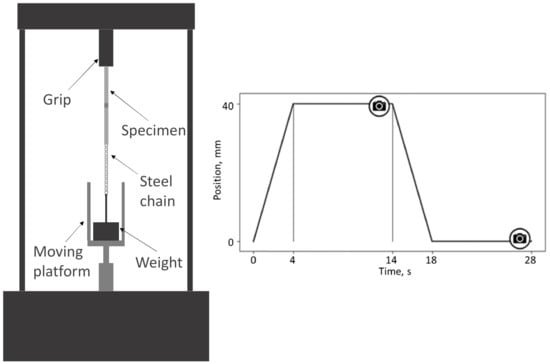 Multiple designs have been proposed in the literature and industry, usually being variations of already existing designs. For instance, the creep tests can be performed under tensile [], compressive [], or shear loading []; the testing setups generally locate the specimen in a vertical position but can also employ a horizontal position []; the application of the load on the specimen can be carried out by hanging weights on the test specimen [], where pulleys can also be used to relocate the weights’ location. Additionally, electric or hydraulic actuators for higher loads and variable applied load [] can be used, as well as levers to provide a mechanical advantage to apply higher loads with smaller weights [].