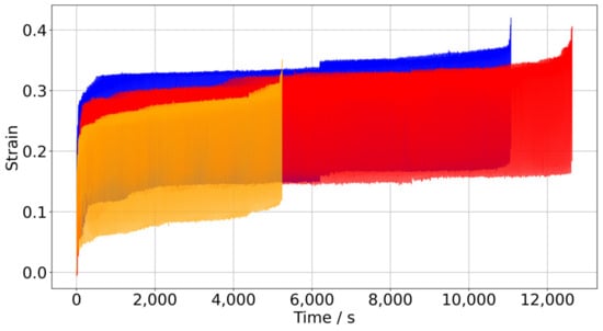 By selecting the shortest curve from each plot due (with similar failure time), a comparison of the results can be carried out more clearly, where it is visible that the top and bottom parts of the curves are almost parallel due to the near constant amplitude throughout the duration of the test (Figure 13). The almost constant amplitude of the strain values, indicate that this adhesive can recover almost all of the deformation, until the tertiary phase where failure occurs. This would be a cyclic creep property of the material and thus the test setup needs to be able to capture this characteristic behaviour.