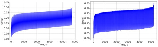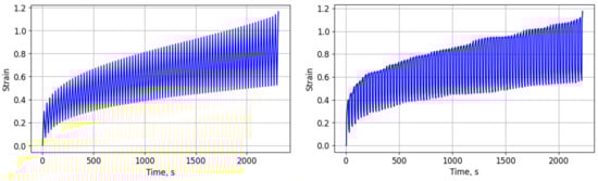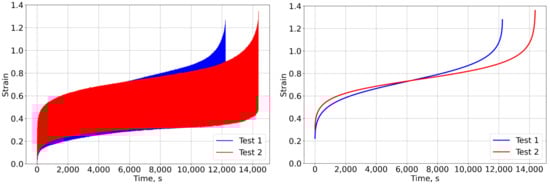 From Figure 19 on the left, it is possible to observe that the two tests presented good repeatability both for strain to failure and failure time. As expected, there are some variations in the failure time since it is a frequent characteristic of creep testing in PSAs. However, this variation is acceptable from the repeatability point of view, with very consistent values for the strain to failure, varying between approximately 1.26 and 1.34. Figure 19 on the right depicts the creep curves that can be retrieved from the cyclic creep model when fed with the experimental results from the cyclic machine. In this image, it is also clear that both tests present almost coincident curves, with the failure time being the only changing variable. Since this is not induced by the apparatus, as previously validated, the suitability of the machine for this condition can also be assumed.