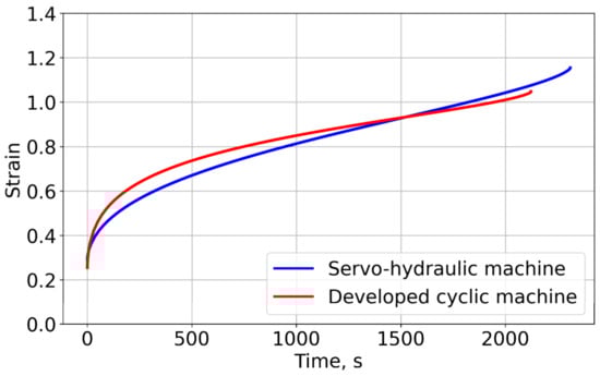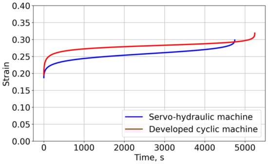 The experimental results for the three conditions mentioned are presented next, comparing the cyclic creep curves obtained in the servo-hydraulic machine and the cyclic creep machine under validation, as well as some preliminary results for the testing at higher temperature. It is worth noting that high values of dispersion were observed in the results, which has also been reported in the literature [,,], for other research involving the study of creep behaviour of PSAs. Therefore, the shape of the curve and, thus, the characteristic creep behaviour of the adhesive is more relevant to validate the cyclic creep machine rather than the time to failure or strain. The behaviour observed in both machines must be similar, which should translate into similar shapes of the curves obtained, although there may be slight variations in the strain to failure and large variations in the time to failure.