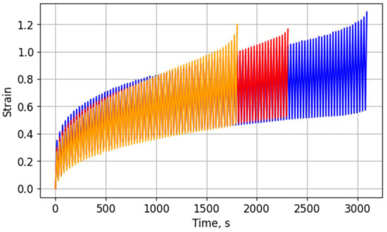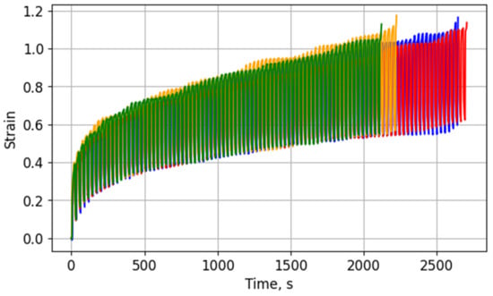 The experimental cyclic creep curves from Adhesive B at 60% load level and RT are shown in Figure 15 for the servo-hydraulic machine (three tests), and Figure 16 for the cyclic creep machine under validation (four tests).