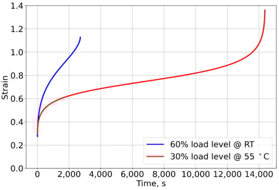 By observing Figure 20, it becomes evident that the shape, the strain to failure, and the failure time are all affected by the change in the testing conditions. Regarding the shape of the curve, an increase in the development of the secondary phase for the 30% load level can be seen, which is in accordance with a more favourable stress state, presenting a slower progression of the strain levels. This behaviour also explains the difference in the failure time, which is 5.3 times higher for the lower load level. Finally, the increase of the strain to failure is explained by the temperature at which the test was performed. By increasing the temperature, the material becomes softer and there is a higher mobility of the polymer chains, which induces higher deformations before failure.