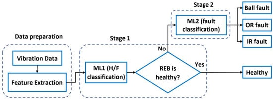The training results have shown that the SVM with a polynomial kernel function and an ANN with a single hidden layer and a 5% dropout rate have achieved the highest accuracies for the first and second stages, respectively. The two-stage model was then tested by the CWRU and MFPT datasets. Despite the challenges in the CWRU dataset, e.g., a large amount of data is not diagnosable, the two-stage model achieved better classification accuracies in three of the health states (healthy and fault in the outer ring and in the inner ring). When tested with the MFPT dataset, a 100% accuracy was achieved for all available conditions. Compared with a single-stage ML model, the two-stage model showed higher accuracies in fault classification.