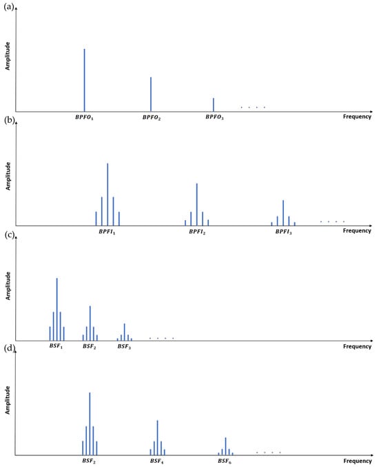 Illustrations of the 33 features of BCFs, their harmonics, and sidebands. (a) OR fault (BPFO and its harmonics), (b) IR fault (BPFI, its harmonics and sidebands), (c) ball fault with both even and odd harmonics and sidebands, and (d) ball fault with even harmonics only and sidebands.