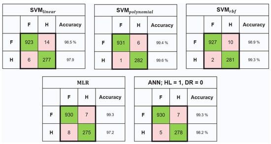 The training results from the first stage are summarised in the confusion matrices in Figure 3 for all five techniques. All the models with optimised architectures have achieved high capabilities of classifying the healthy from the faulty bearings at over 97.2% accuracy. To obtain the optimised ANN model, a range of hyperparameters and configurations were trained by varying the number of hidden layers (HL) and dropout rate (DR); the ANN with 1 hidden layer (HL) and 0 dropout rate (DR) has shown to be the best ANN for this problem (details of the optimisation procedure and results are attached in Appendix B). It uses the ReLu activation function for the hidden layer neuron. An initial learning rate of 0.2 with a drop rate of 0.9 after 30 epochs was considered empirically for the ANN.
