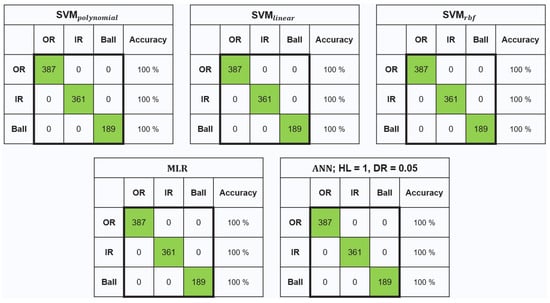 There are 283 healthy bearing samples and 937 faulty ones in the I2BS dataset (see Table 2) that are used to train three types of ML models, i.e., SVM, ANN, and MLR. For the SVM, three types of kernel functions, i.e., linear, polynomial, and radial basis function (RBF) kernels), were explored.
