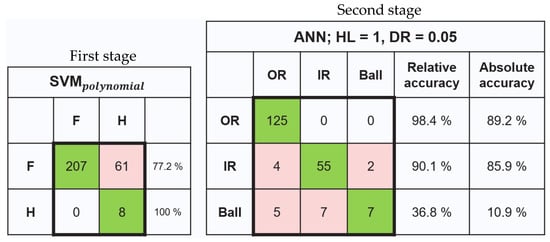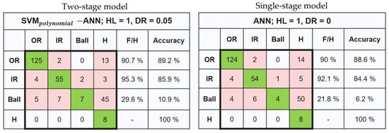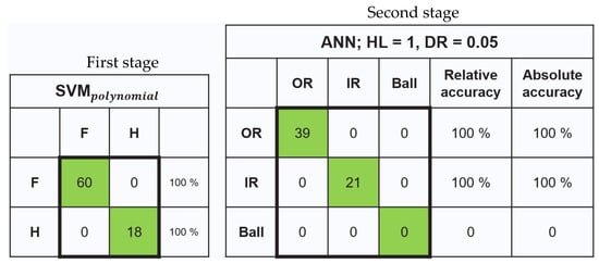 The 207 samples classified as faulty bearings during the first-stage model are then fed into the second-stage model. The results from the ANN are shown in Figure 5 as it has a better accuracy in this stage than the other ML techniques (see details summarized in Appendix D).