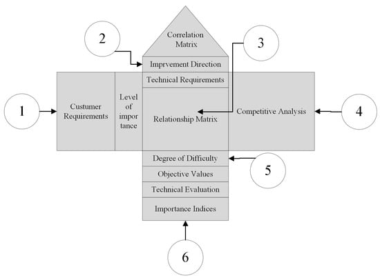 The methodology for quality function deployment (QFD) has become a tool for communication between marketing and production processes in the design of new products []. The key part of the QFD methodology is based on the house of quality diagram, which consists of different elements for the development of the methodology and the presentation of each of the requirements for the product design to be developed [,,,,]. The house of quality is shown in Figure 1 and it consists of six different matrices. According to [,,,], the objective of each matrix is described as follows: