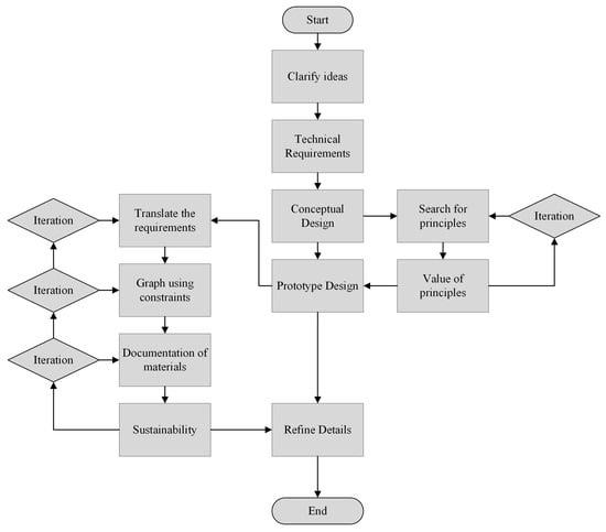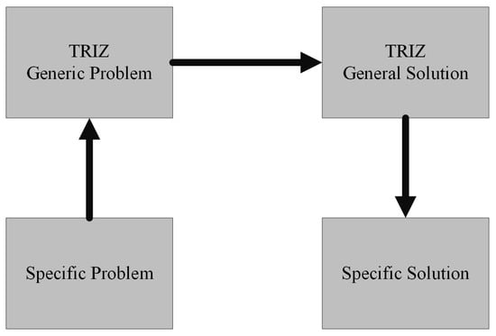 The TRIZ methodology (translated as the theory of inventive problem-solving, or by its Russian acronym, Theoria Resheneyva Isobretatelskehuh Zadach (TRIZ)) [,,] is a methodology that operates through generic models for problem-solving. The basic process of TRIZ is illustrated in Figure 3.