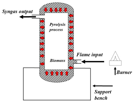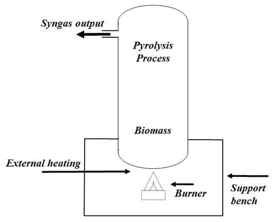 The design of a chemical reactor requires considering the combination of both pyrolysis and gasification processes; these types of processes are carried out at high internal pressures and temperatures in a medium filled with tars resulting from the thermochemical transformations of the process. The design of pressure vessels is carried out following established codes or standards, such as the ASME Code (American Society of Mechanical Engineers) Section VIII, EN 13,445, AD Merkblatter, among others []. Standards are used for the manufacturing, design, and maintenance of pressure vessels because they are designed to prevent accidents within the workplace []. Reactors are devices in the chemical industry used to carry out chemical reactions on a small and large scale. These devices can be designed following the ASME Code standards for pressure vessels or the TEMA (Tubular Exchanger Manufacturers Association) for heat exchangers [,]. These standards provide safety factors for the design of internal pressure, heat transfer, and process efficiency.