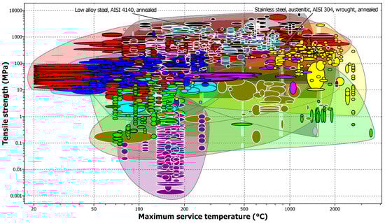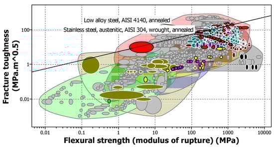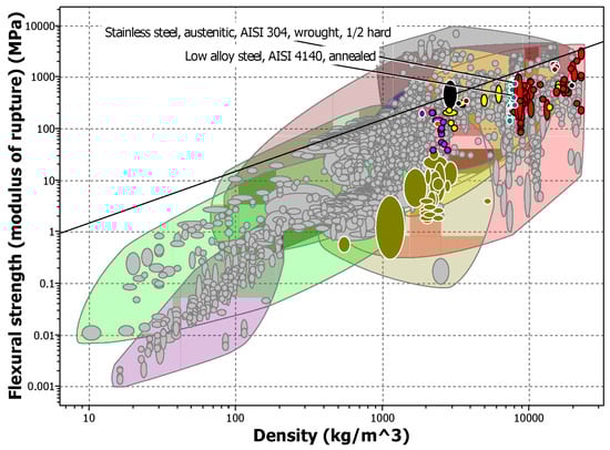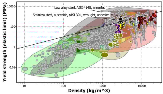 - Ashby, M.F. Material Property Charts. In Materials Selection in Mechanical Design; Elsevier: Amsterdam, The Netherlands, 2013; pp. 57–96. [Google Scholar] [CrossRef]
