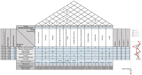 The quality function deployment (QFD) methodology has been applied to external instruments of a reactor or a pressure vessel, as in the case of Ismail et al. [] for the development of a deployment arm for a platform in a boiler using this methodology. The quality function deployment methodology is focused on transforming customer desires into technical requirements for product design [,]. This methodology is utilized in the development and improvement of activities, enabling its application to manufacturing processes, services, and product design, as in the case of Lorenzo et al. [], who applied the QFD (quality function deployment) methodology to healthcare management, and Sharma and Rawani [] in healthcare. Likewise, it has been used as a complementary tool for pressure vessels, like in the case of Ismail et al. [] for a deployment arm platform. Table 1 shows different applications of the QFD methodology in various areas of study, including design, manufacturing, planning, chemical processes, health, and services.