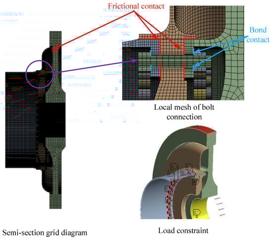 In order to enhance solution efficiency and computational convergence, it is necessary to perform geometrical cleanup and simplify the turbine-disc–drum combined structure before modeling. This involves (1) removing chamfering and chamfering features from each part and (2) not considering the bolt thread contact effect and instead using a simplified bolt to simulate the standard bolt equivalently. Since the contact effect of the combined surface of the turbine disc drum structure will significantly impact the accuracy of the results, and the contact characteristics are sensitive to the mesh quality, it is necessary to refine the mesh in the key areas of this part.