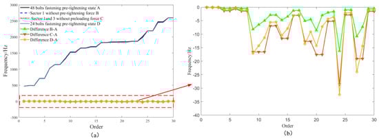 The influence of the pre-tightening state on the natural frequency of the disc–drum connection component. (a) Comparison of frequencies under different preloading states, (b) the difference in frequency in different preloading states.