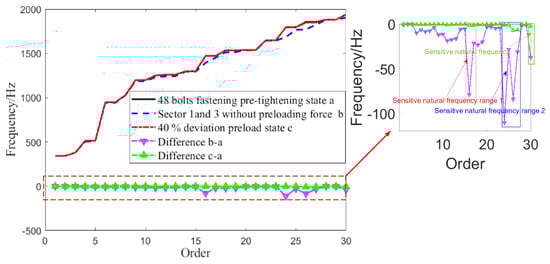 The first 30 natural frequencies of the disc–drum connection assembly under the preloading state are shown in Figure 4. The low-order natural frequency is less affected by the preloading state. The main reason is that the low-order performance is the overall deformation of the component, and the number of bolts is large. When the preload of some bolts is greatly reduced, the mating surface still maintains a high overall stiffness. However, there are some sensitive orders of natural frequency change in the middle and high order frequency. These orders of natural frequency are sensitive to the change in preload state.