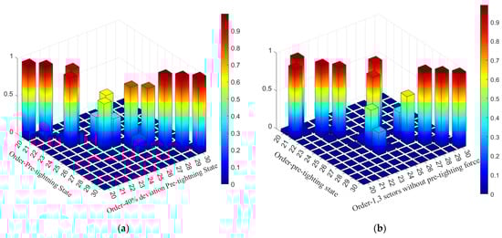 It can be seen from Figure 7a that when there is a pre-tightening state under deviation of 40%, compared with the pre-tightening state, the 22-order and 23-order have a sequential step phenomenon, and the 24-order and 25-order tend to have a modal step phenomenon. The MAC values of the two orders are decreasing. As the further pre-tightening state degrades, the stiffness loss increases and the modal step phenomenon occurs. It can be seen from Figure 7b that with the degradation of the preloading state when there is no pre-tightening in sectors 1 and 3, the 24-order modal shape of the disc–drum composite structure is highly correlated with the 26-order modal shape of the disc–drum composite structure under a pre-tightening state of 48 bolts, and the 26-order modal shape is highly correlated with the 24-order modal shape of the pre-tightening state of 48 bolts, that is, the modal step phenomenon occurs. At the same time, the modal step phenomenon also occurred in the 20 and 21 modal shapes.