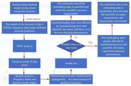 Therefore, first of all, we can create a high-precision finite element model of the disc–drum assembly. Through modal analysis, we can identify the sensitive natural frequency and modal shape affected by the preloading state. Subsequently, we can position the acceleration and vibration sensors based on the characteristics of the sensitive modal shape for modal test research in engineering practice. Finally, using the change in sensitive natural frequency as a reference, we can determine the preloading state of the disc–drum assembly during the assembly identification stage.