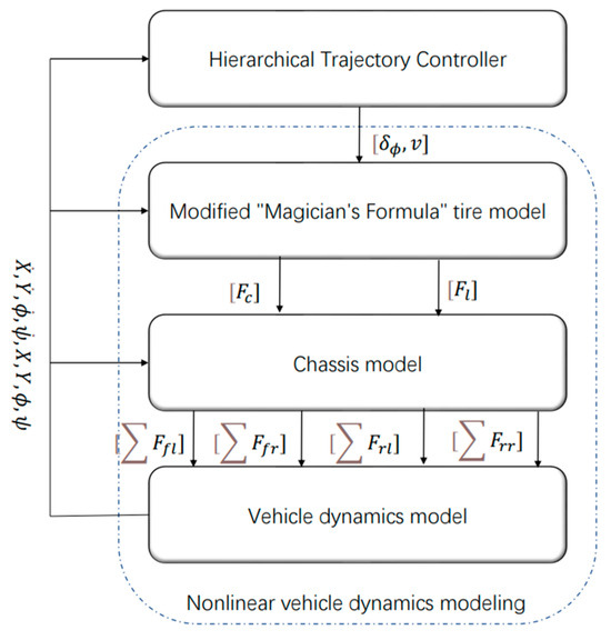 The proposed nonlinear vehicle model includes a vehicle dynamics model, a chassis model, and a modified “magic formula” tire model. The vehicle dynamics model is used to analyze the state feedback of the vehicle system under the action of external forces and moments, and by selecting multiple state variables to accurately derive vehicle motion states under a given input, the chassis dynamics model is used to connect the vehicle dynamics model and the tire model, and the tire model analyzes the state feedback of the vehicle system under the action of the current state change of the vehicle system (including the change of steering wheel angle due to steering wheel angle, the change of drive tire slip rate due to longitudinal vehicle speed, etc.) and analyzes the state feedback of the external forces and moments. The tire model is used to analyze the state feedback of external forces and moments under the current state changes of the vehicle system (including the change of steering wheel angle due to steering wheel angle, the change of drive tire slip rate due to longitudinal speed, etc.), and accurately quantifies the values of external forces and moments through the model. The vehicle dynamics model, chassis model, and modified “magic formula” tire model together form a controlled closed-loop model, based on which the trajectory tracking controller provides the tire model with control quantities to achieve closed-loop control of the vehicle motion state, and the control structure is shown in Figure 1.