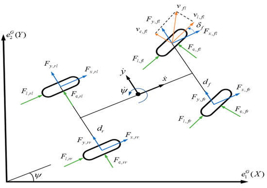 The chassis dynamics model is used to connect the vehicle body dynamics with the tire model, decouple the coupled state variables of the vehicle body and input them into each tire model, and integrate the longitudinal and lateral forces output from each tire model into the combined forces applied to the vehicle body. The chassis dynamics model is shown in Figure 3. The tire forces in each independent tire reference system can be translated into the vehicle reference system and ground reference system, and the tire forces and velocities of each tire are expressed as: . The is the state variables, is the tire force, is the tire velocity, and is the wheel angle; is the reference direction, , and are the longitudinal and lateral directions of the tire reference system, and are the and axis directions of the vehicle reference system, is the axis direction of the vehicle reference system, and are the and axis directions of the ground reference system; is the axle positioning, , and are the front and rear axles; is the side positioning, , and are the left side of the body and the right side of the body.