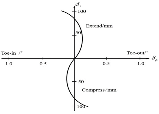 A common roll-steering curve is shown in Figure 4. A roll steering condition that tends to steer to the inside of the vehicle is called toe-in, and a condition that tends to steer to the outside is called toe-out. The roll steering is equivalent to superimposing the wheel angle on all four wheels, as shown in Figure 4. The wheel angle is related to the distance of suspension moving, which can be obtained from the roll angle and the suspension geometry.