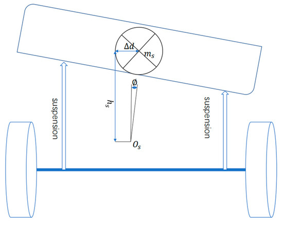 From Figure 1, the distance between the center of the sprung plane and the center axis of roll is set to , then the position vector of the plane center relative to the origin of the vehicle reference base is given by