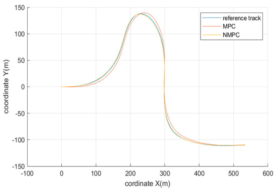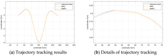The simulation results are shown in Figure 17, Figure 18, Figure 19, Figure 20 and Figure 21. Figure 17 indicates the trajectory tracking result of the hierarchical trajectory tracking controller, and it can be seen that the control result of the controller is significantly efficient under the double shift line condition, and the lateral position accuracy and yaw angle accuracy of the controller at the bend are good, and the lateral error is controlled within a very small range. The trajectory of the controlled vehicle completely tracks on the desired trajectory and completes the driving maneuver for the double shift line condition with negligible tracking error. This is partly due to the reduced speed of the vehicle; on the other hand, compared with the serpentine condition, the controlled vehicle is in the double-shifted line condition, which has a small turning arc. On the other hand, it shows that there is little room for improvement in this paper compared to the control effect of the classical MPC in scenarios similar to the double shift line condition. As can be seen in the locally enlarged view of Figure 17b, the improvement of NMPC with respect to MPC is not significant, and in terms of the global trajectory, there is essentially an overlap.