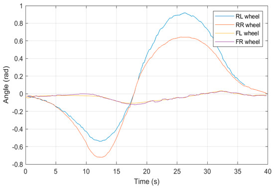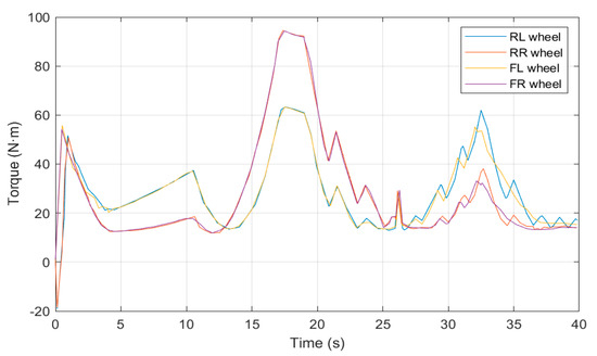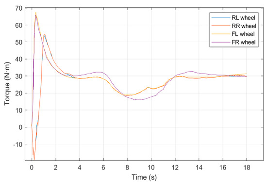 As part of the vehicle motion modeling improvement, especially for the 4WS4WD, the angles and torques of its four wheels need to be studied. Figure 11 and Figure 12 display the change curves for the control variables of four-wheel tire angle and four-wheel torque. Four-wheel drive torque at curved roads with large curvature decreases to improve the stability and trajectory tracking accuracy of the vehicle in curved sections and increases in straight sections to compensate for the time difference between the curvature The four-wheel drive torque is reduced at curved sections to improve the stability and trajectory tracking accuracy of the vehicle in curved sections; it is increased at straight sections to compensate for the time difference between the deceleration at curved sections and the trajectory sequence. Among the four wheel angles, the front wheel angle plays the role of steering, so the control quantity value is small and the response is fast. In four-wheel cornering, the front wheel cornering plays the role of steering, so the control volume value is small and quick response; the rear wheel cornering plays the role of stabilization and feedback to compensate for the vehicle’s traverse angular velocity, so in the corners where the traverse angular velocity is large, the rear wheel cornering plays the role of stability. The rear wheel angle is also larger at the corners of the road.