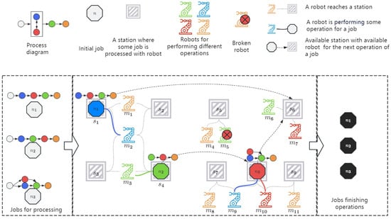 Flexible job shop scheduling (FJSP) is regarded as an effective measure to deal with the challenge of mass personalized and customized manufacturing in the era of Industry 4.0, and is widely extended to many real applications []. In this paper, we focus on a kind of extended FJSP, which considers both technology and path flexibility (dual flexibility), varying transportation times among stations, and an uncertain environment. This extended FJSP is termed FJSP-DT (FJSP with dual flexibility and transportation time variation). FJSP-DT occurs in real complex scenarios, such as distributed automobile assembly scheduling, multiple aircraft maintenance scheduling, and robot scheduling in a warehouse sorting center, etc. FJSP-DT takes the following characters into consideration and is abstractly depicted in Figure 1.
