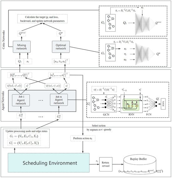 Wang et al. (2021) [] proposed a flexible and hybrid production scheduling problem and introduced a multi-agent deep reinforcement learning (MADRL) scheduling method called Multi-Agent Deep Deterministic Policy Gradient (MADDPG). Similarly, Wang et al. (2022) [] introduced a modeling method of the decentralized partially Markov decision process (Dec-POMDP) for the resource preemption working environment (PRE), and applied QMIX to solve the PRE scheduling problem, where each job is an agent who selects its action according to current observation. Jing (2022) [] designed a MARL scheduling framework based on GCN, namely a graph-based multi-agent system (GMAS), to solve the FJSP. First, a probabilistic model of the directed acyclic graph of the FJSP is constructed from the product processing network and workshop environment. Then, the author modeled the FJSP as a topological graph prediction process and adjusted the scheduling policy by predicting the connection probabilities between the edges.