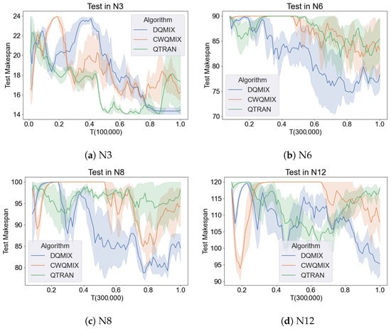 Table 12 presents the results of the robot breakdown generalization test for the three algorithms. Overall, the results show that all three algorithms have good generalization under robot breakdowns. The average makespan of DQMIX is significantly lower than that of the other two algorithms, which suggests that DQMIX’s solution quality is superior. However, the solving success rate of DQMIX is slightly lower than that of CWQMIX. This is because some solutions generated by DQMIX exceed the upper bound of the makespan set by the worker. In terms of stability, the of QTRAN is the smallest, and it seems that QTRAN is the most stable. However, when we take into account the deviation of the makespan from the optimal solution, as captured by the metric, we observe that DQMIX performs better. In fact, DQMIX has both higher solution quality and greater stability than QTRAN when we consider .