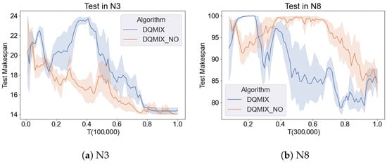 According to Figure 5a, we observe that DQMIX-NO outperforms DQMIX in terms of convergence speed and final solution quality. However, in the N8 case (Figure 5b), DQMIX converges faster and achieves better results than DQMIX-NO. Additionally, DQMIX demonstrates greater stability in both cases.