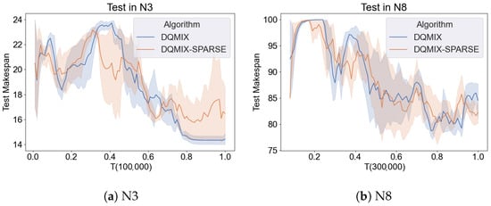 Figure 6a shows that in the case of N3, DQMIX achieves better convergence and solution quality than DQMIX-SPARSE, while in the case of N8 (Figure 6b), the difference between the two is not significant in terms of convergence. It is worth noting that our training policy of sampling complete trajectories in batches and using them for learning may alleviate the negative impact of sparse feedback on model training.