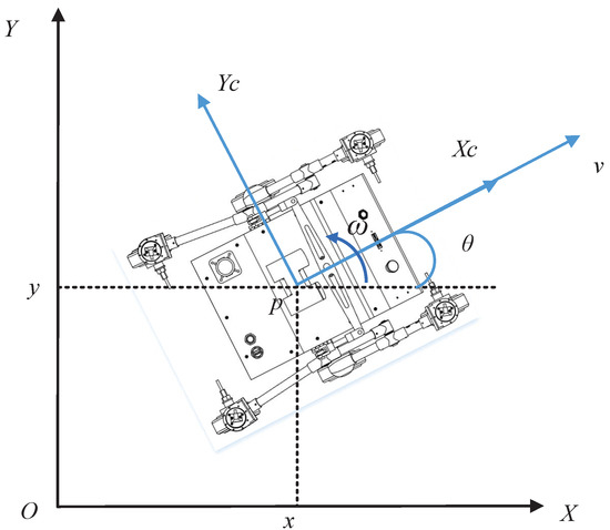 As shown in Figure 1, the drive wheel axle of the wheeled mobile robot passes through the robot’s centroid. The left and right drive wheels are powered by hub motors, enabling forward, backward, and steering movements. Point P is the midpoint of the hub motor axle, with coordinates in the global coordinate system. represents the robot’s orientation angle (the angle between the robot’s linear velocity and the X-axis), while v and w denote the robot’s linear and angular velocities, respectively.