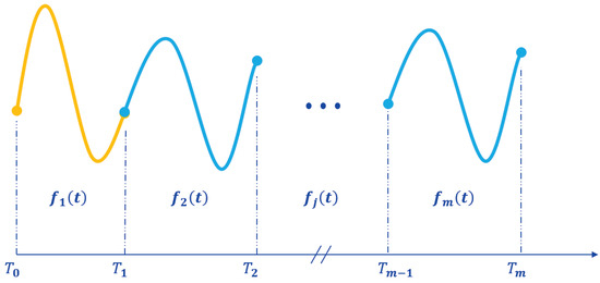 Each pair of consecutive path points can be connected by an n-th-order polynomial function. For m + 1 path points identified in the path search (including the start and goal points), all points can be connected by m segments of n-th order polynomial curves to obtain a piecewise continuous trajectory curve with smooth derivatives of all orders, as shown in Figure 3. Except for the endpoints of the initial and final segments, each endpoint of the previous polynomial trajectory segment shares the same path point as the starting point of the next polynomial trajectory segment.