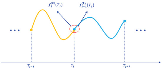 In addition to the specified constraints at the endpoints mentioned above, there are also continuity constraints for the derivatives at the connection points between consecutive trajectory segments. These constraints include the continuity of velocity (first derivative), acceleration (second derivative), and jerk (third derivative), as illustrated in Figure 5.