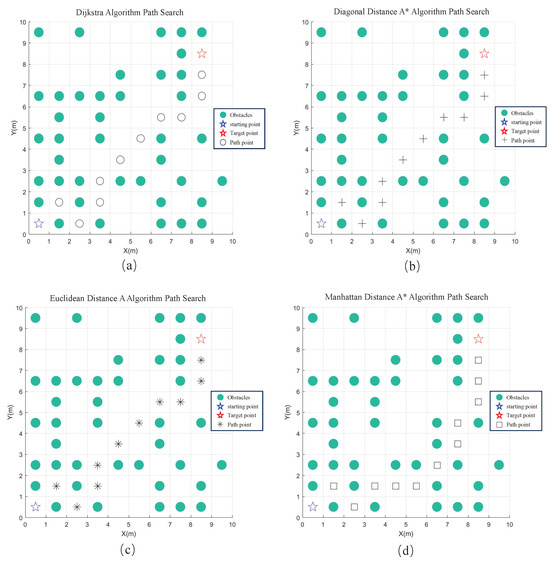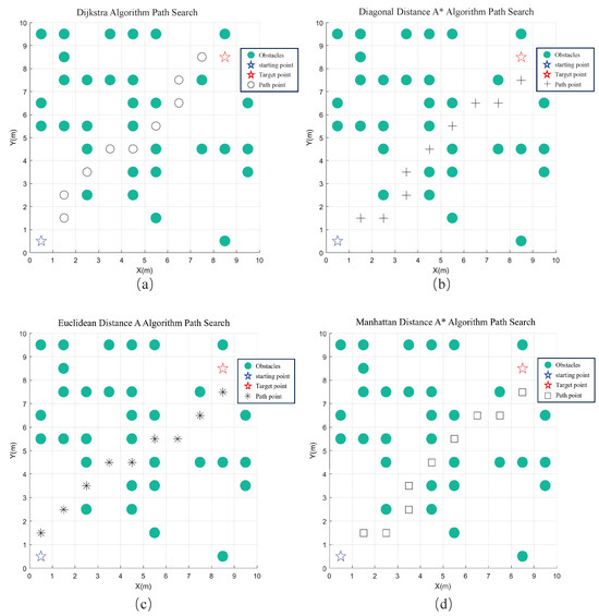 The green solid circular scatter plots in Figure 7 and Figure 8 represent obstacles. The blue pentagram scatter plot in the bottom left corner denotes the starting point, while the red pentagram scatter plot in the top right corner signifies the target point. The black hollow circular scatter plots illustrate the paths obtained by the Dijkstra algorithm, as shown in Figure 7a and Figure 8a. The black cross-shaped scatter plots depict the paths obtained by the OTPWR method using diagonal distance A*, illustrated in Figure 7b and Figure 8b. The black star-shaped scatter plots represent the paths obtained by the Euclidean distance A*, shown in Figure 7c and Figure 8c. The black square-shaped scatter plots denote the paths obtained by the Manhattan distance A*, as shown in Figure 7d and Figure 8d.