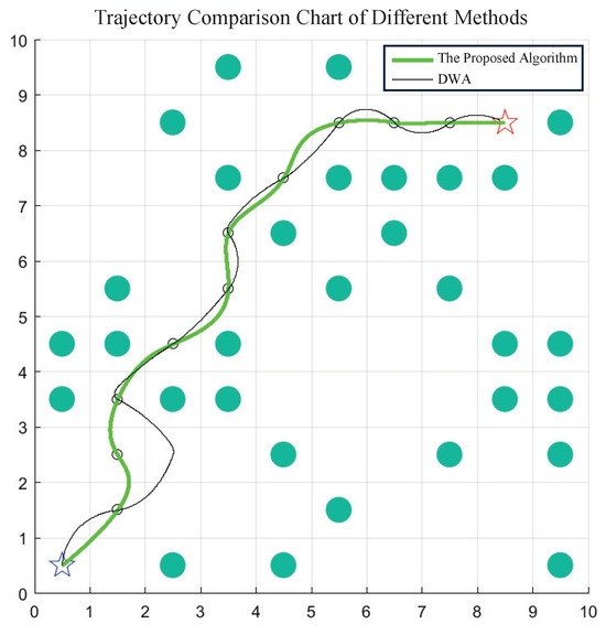 In the previous section, the OTPWR method proposed obtained validated optimal discrete path points during the path search phase. On this basis, in the trajectory generation phase, it was compared with the traditional DWA to verify whether the dynamical performance of trajectory generation in OTPWR meets global optimality.