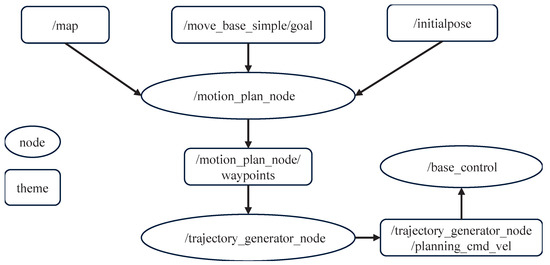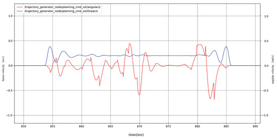 To validate the effectiveness of the proposed OTPWR algorithm, trajectory planning experiments were conducted using a prototype in a static indoor environment. First, a 2D grid map with a resolution of 0.2 m was constructed using LiDAR within a school building. The OTPWR algorithm then planned the robot’s movement based on the selected start and goal points. The ROS node topics are illustrated in Figure 14. After the algorithm was executed, the robot’s target trajectory points and the corresponding command velocities, which satisfied all constraints, were obtained within milliseconds. The planning results, displayed in the rviz interface (Figure 15), show the map’s white areas as free space, with the black arrow representing the start point, the green arrow the goal point, and the red curve the optimal, collision-free path generated by the algorithm, which adheres to the robot’s constraints. The robot’s velocity commands were obtained using ROS’s rqt tool, as shown in Figure 16. The blue curve represents the linear velocity command, and the red curve represents the angular velocity command. Both the linear and angular velocities comply with the robot’s speed constraints, demonstrating the effectiveness of the proposed OTPWR algorithm on the experimental prototype platform.
