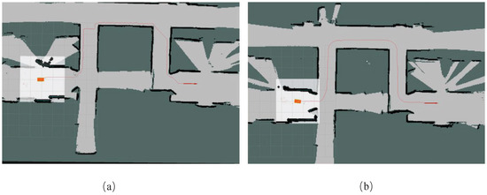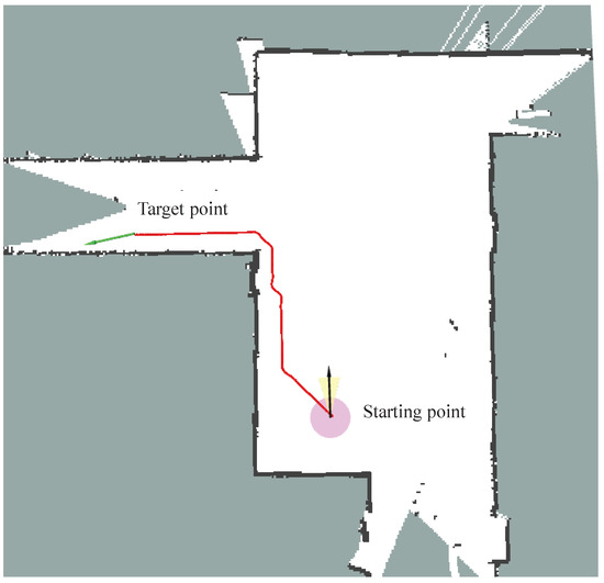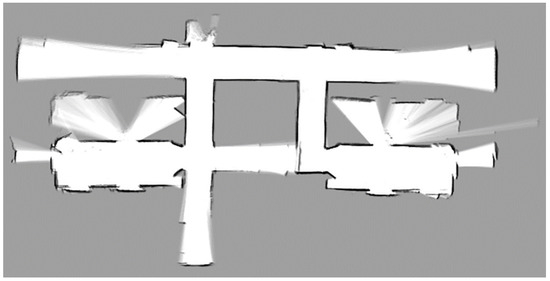 After validating the effectiveness of the algorithm on the experimental prototype, further testing was conducted to evaluate the path planning performance of the proposed OTPWR algorithm in more complex environments. A larger 2D grid map was constructed using LiDAR within the same school building. The OTPWR algorithm was then compared with the classic A* algorithm. The constructed map is shown in Figure 17, and the results of the two algorithms are illustrated in Figure 18. As shown in Figure 18a, the path generated by the classic A* algorithm is too close to obstacles, with minimal safety margins. In contrast, the OTPWR algorithm, as depicted in Figure 18b, produces a path that stays closer to the center of the corridor, maintaining a larger safety distance from the corridor boundaries.