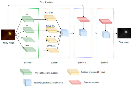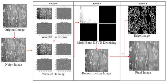 Figure 1 illustrates that the algorithm proposed in this paper includes an encoder, Subnetwork 1, Subnetwork 2, and the final decoder. The encoder decomposes the original image, after noise addition, into low-frequency, horizontal, vertical, and diagonal subbands using two-dimensional wavelet decomposition. Subnetwork 1 applies the KSVD algorithm to denoise each subband from the encoder, thereby significantly reducing processing time. Following wavelet reconstruction in Subnetwork 1, the algorithm generates the denoised image. Subnetwork 2 enhances the reconstructed image with edge information extracted using the Canny algorithm, based on the noisy image, to achieve edge-enhanced results after boundary perception. Finally, the decoder processes and displays the final image.