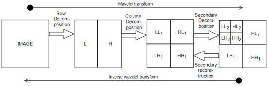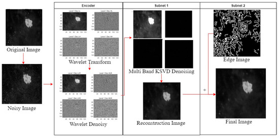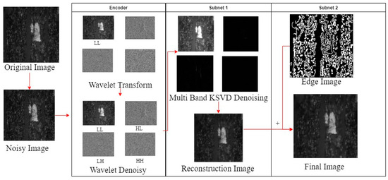 Multi-band wavelet decomposition occurs in the encoder stage of the process. During this stage, the input noisy image undergoes multi-band wavelet decomposition using 2D-DWT, as informed by experimental experience. Thus, its mathematical model can be represented by Equations (1), (2), and (5), as follows: