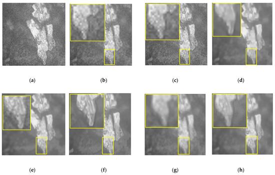 Comparison of different denoising algorithms for real image. (a) Noisy image; (b) wavelet; (c) 2D-VMD; (d) BM3D; (e) ACPT; (f) NLH; (g) WVBOD; and (h) W-KSVD-EDGE.