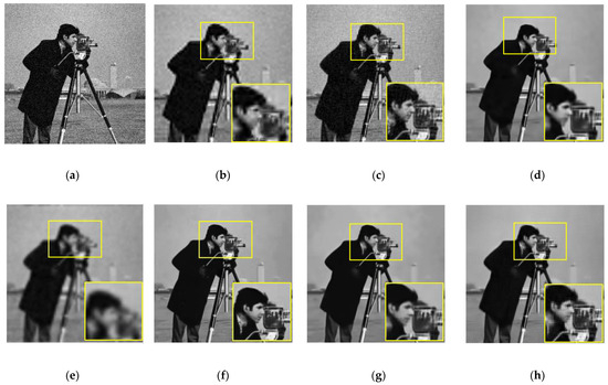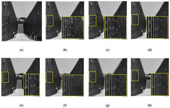 Comparison of different denoising algorithms for cameraman image. (a) Noisy image; (b) wavelet; (c) 2D-VMD; (d) BM3D; (e) ACPT; (f) NLH; (g) WVBOD; and (h) W-KSVD-EDGE.